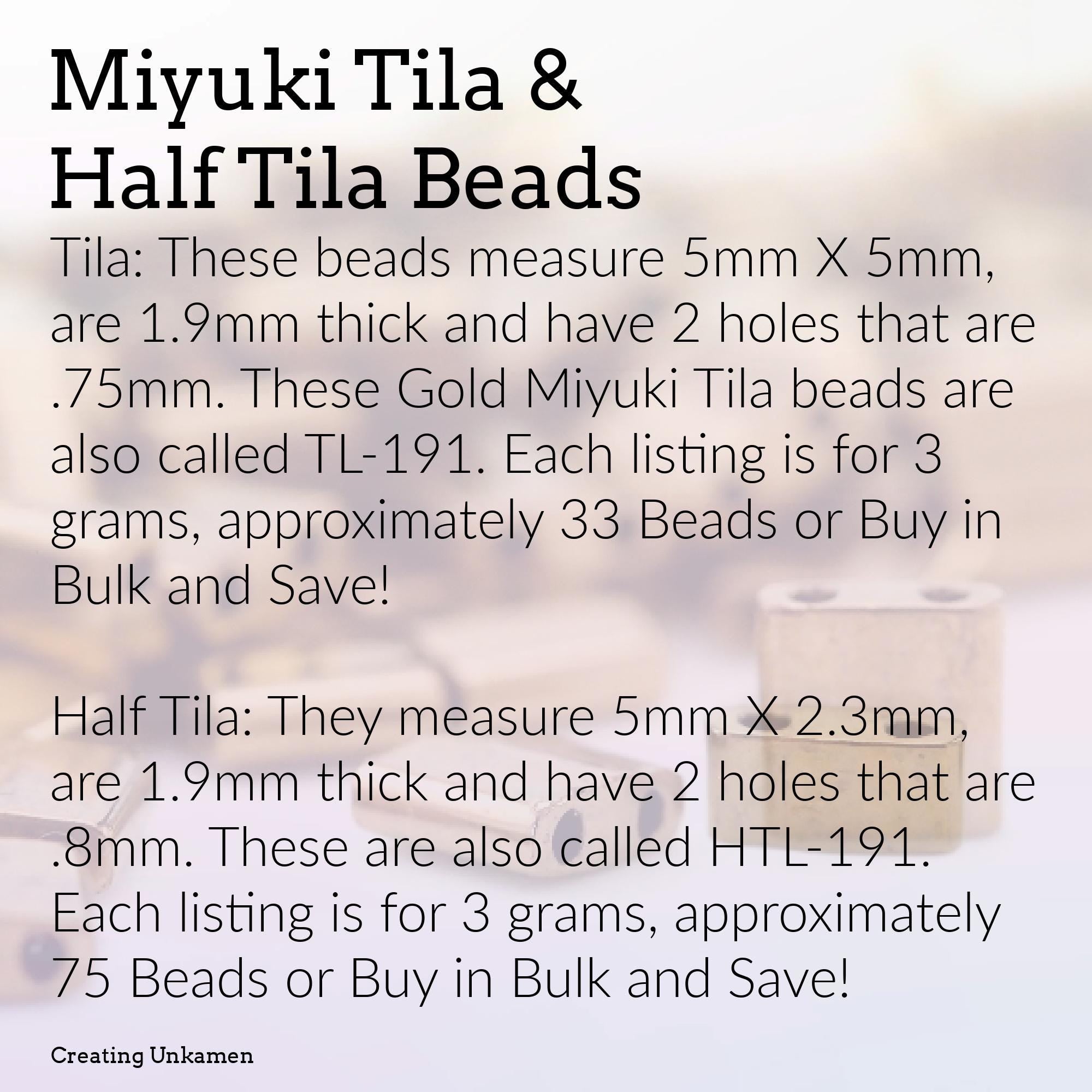 Tila: These beads measure 5mm X 5mm, are 1.9mm thick and have 2 holes that are .75mm. These Gold Miyuki Tila beads are also called TL-191. Each listing is for 3 grams, approximately 33 Beads or Buy in Bulk and Save!