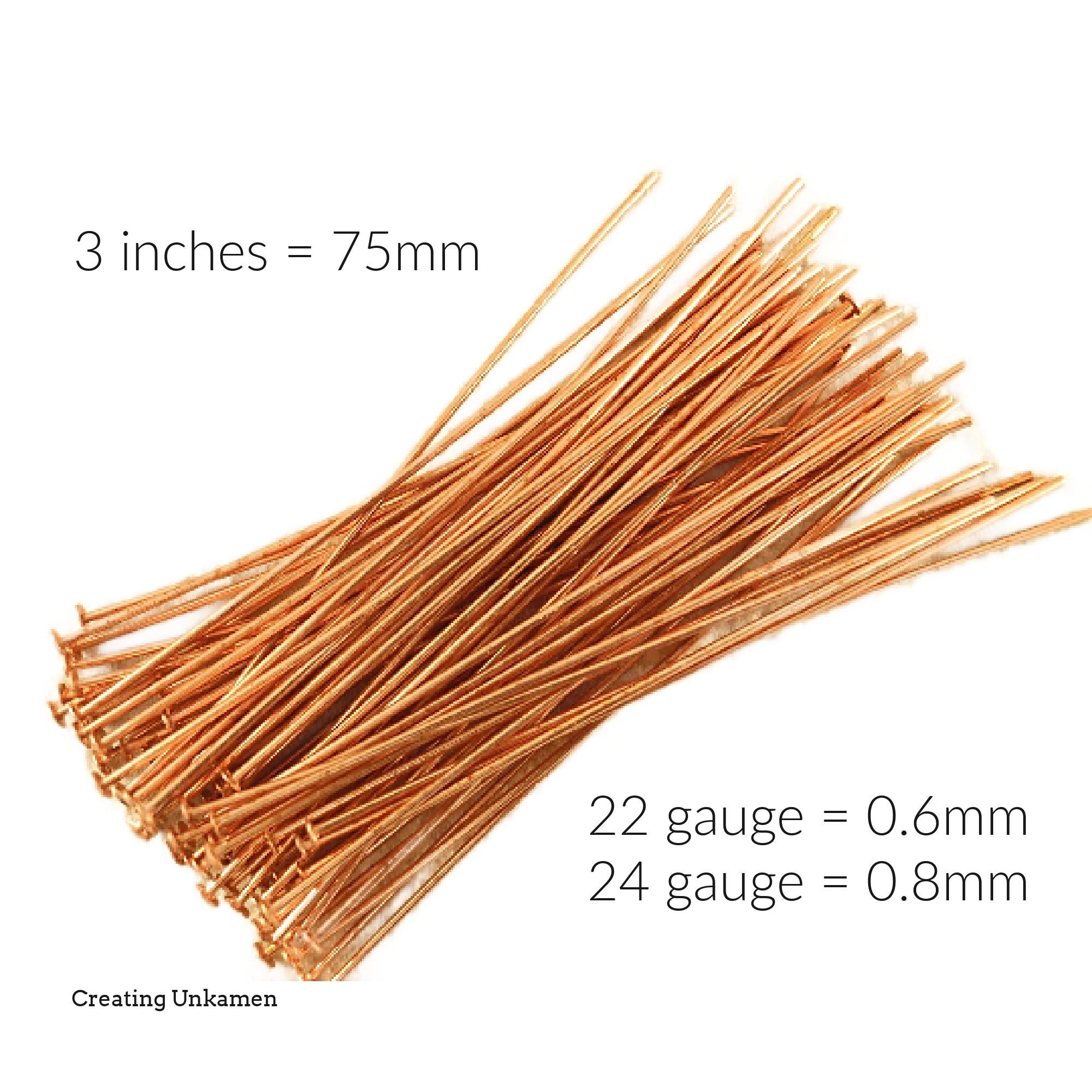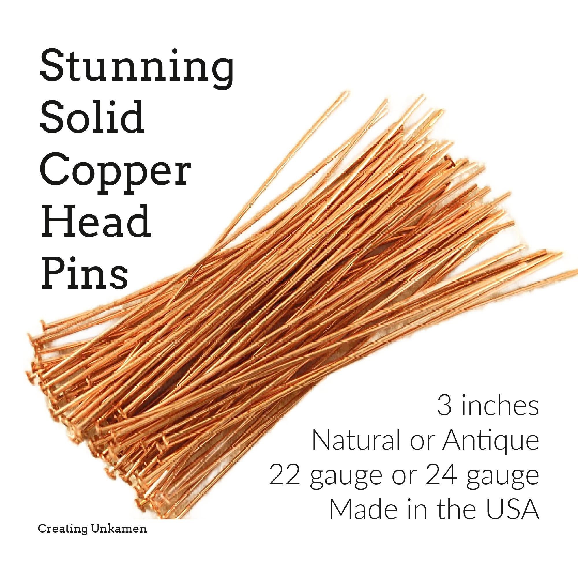 If any head pin can be stunning, these solid copper head pins are! These head pins will finish off your special jewelry creation perfectly. These head pins are made from 22 gauge or 24 gauge solid copper wire, in the USA and have a 2mm head. Choose from Natural, shiny penny bright, or Antique, medium brown with reddish hints, which is the result of a hand applied patina. These head pins will also arrive almost perfectly straight! Each listing is for 100 head pins.