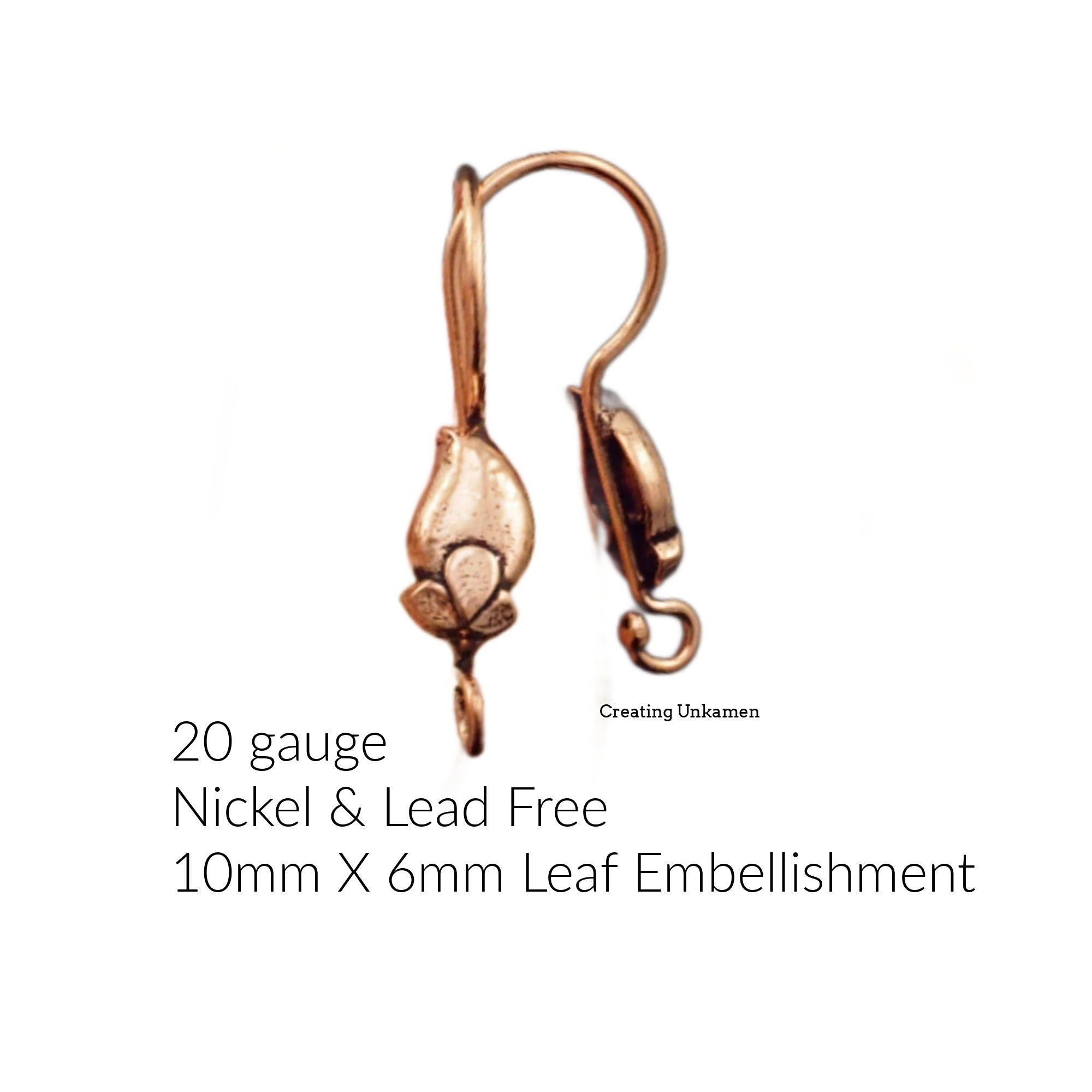 These Antique Copper Ear Wires are perfect for your special earring creations! The base metal of these ear wires is copper, the ends are smooth and they are nickel and lead free so your customers will love that. These ear wires are made from standard 20 gauge wire. They are available in antique copper and feature a 10mm X 6mm Leaf Embellishment! Each listing is for 4 pairs of ear wires.