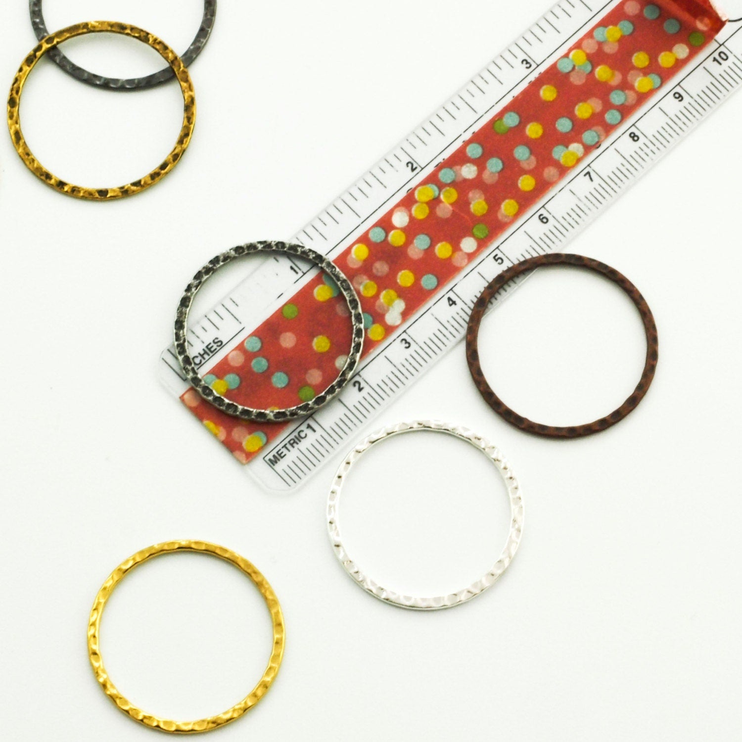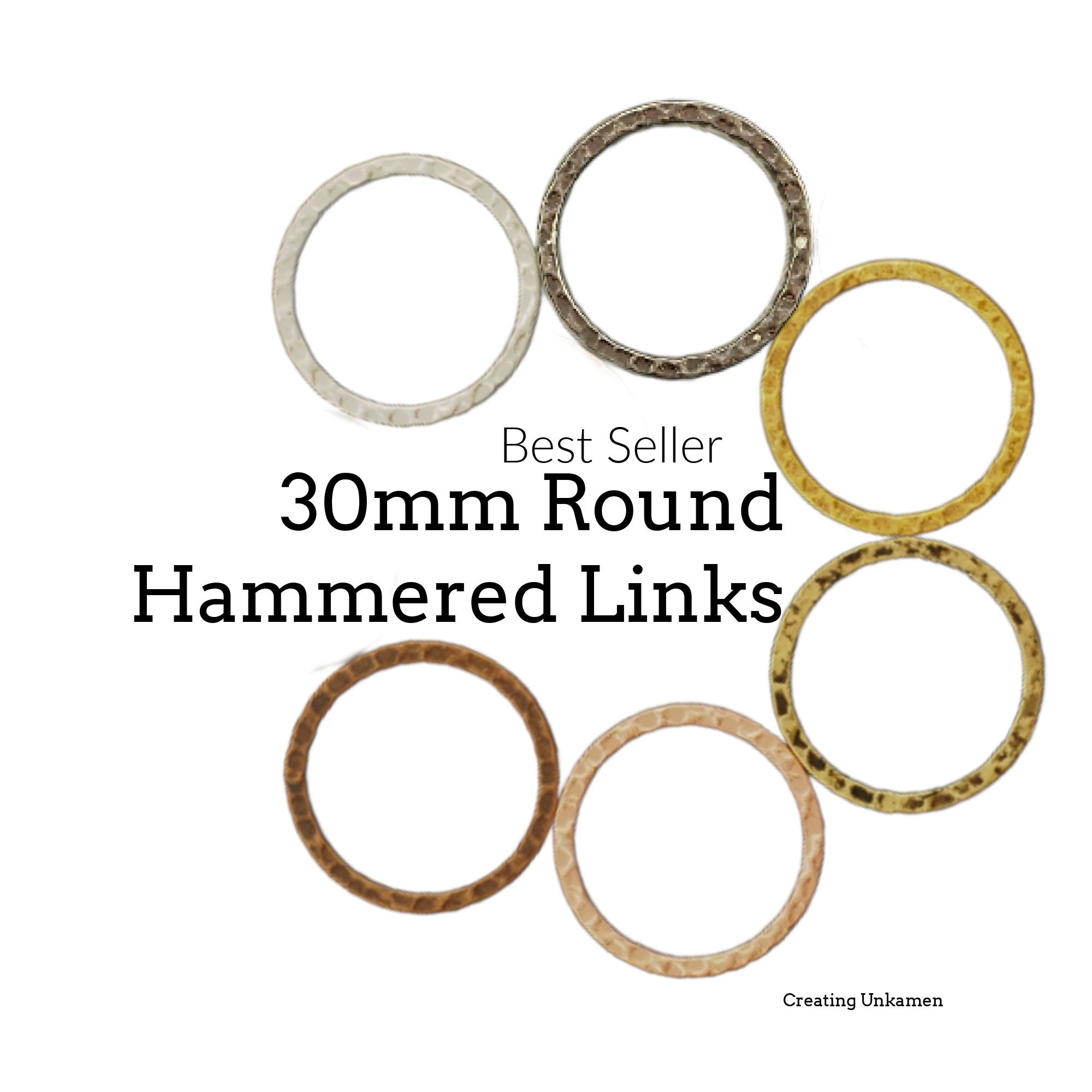 These hammered round connector links are perfect to use for charms, links and embellishments. These lnks are solid, closed, hammered components. These links measure 30mm outside diameter (25.5mm ID) and have a base metal of steel. They look the same on both sides. Each listing is for 6 links.