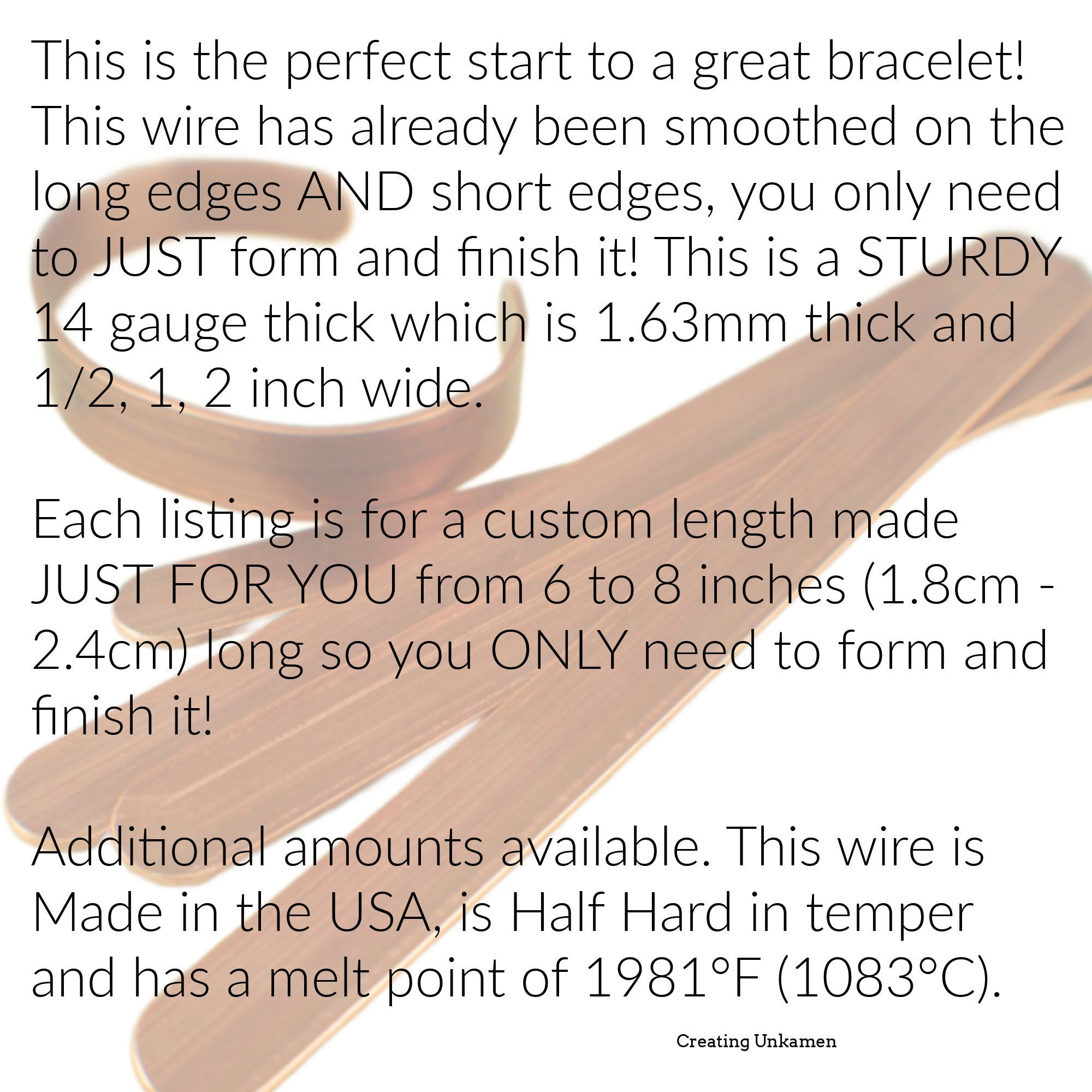 This is the perfect start to a great bracelet! This wire has already been smoothed on the long edges AND short edges, you only need to JUST form and finish it! This is a STURDY 14 gauge thick which is 1.63mm thick and 1/2, 5/8, 1, 2 inch wide. Each listing is for 1 flat blank.