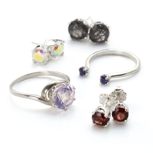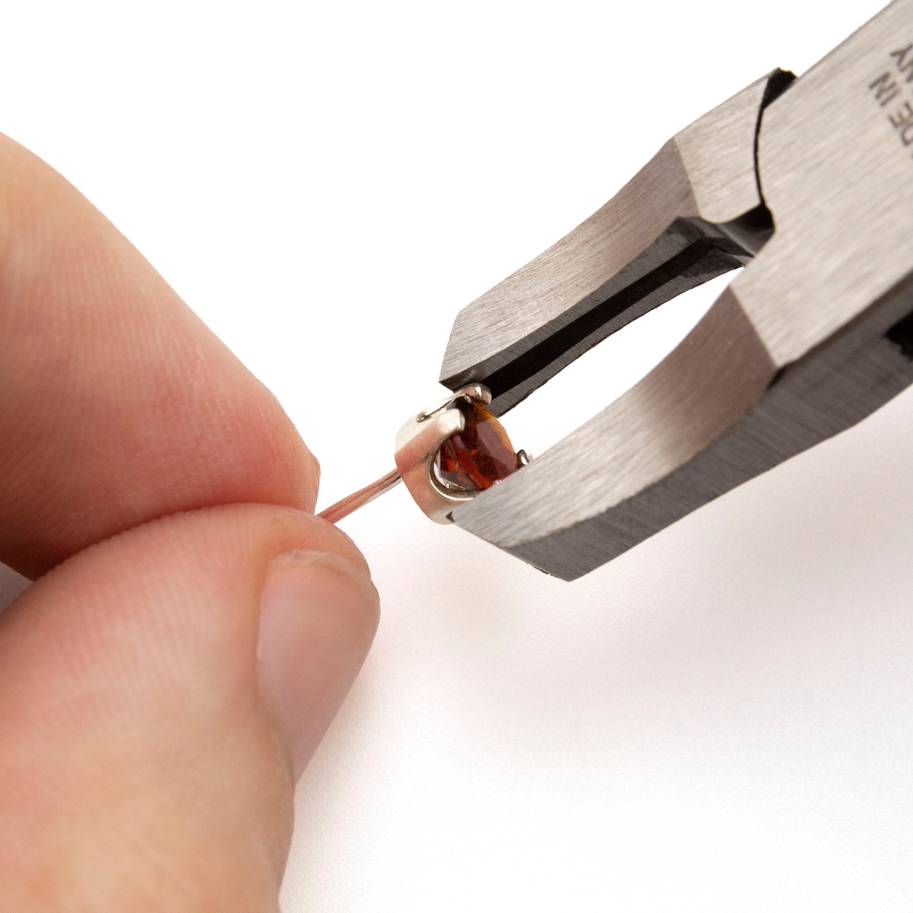 While working with a stone and setting, place the grooved part of the plier over one of the prongs. Gently push the prongs over the top of the faceted stone, being careful not to mark the stone or bend one prong more than others causing the stone to sit off center. We recommend working your way around the setting by pushing opposite prongs, adjusting a little bit each time to make sure that there is even pressure across the top of the stone and that the stone is held nice and secure.