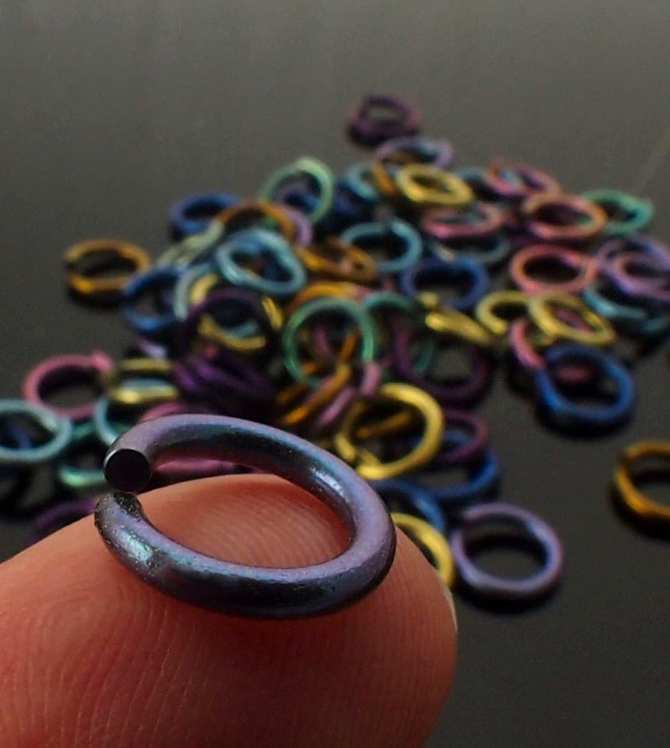 This listing is for 100 Solid Anodized Titanium jump rings in 14, 16, 18, 20 or 22 gauge and a wide variety of diameters. These are our handcrafted rings which can be used in chainmaille, jewelry designs and even used for piercings! If your preferred size isn't listed contact us. These will arrive freshly tumbled and custom anodized for you!