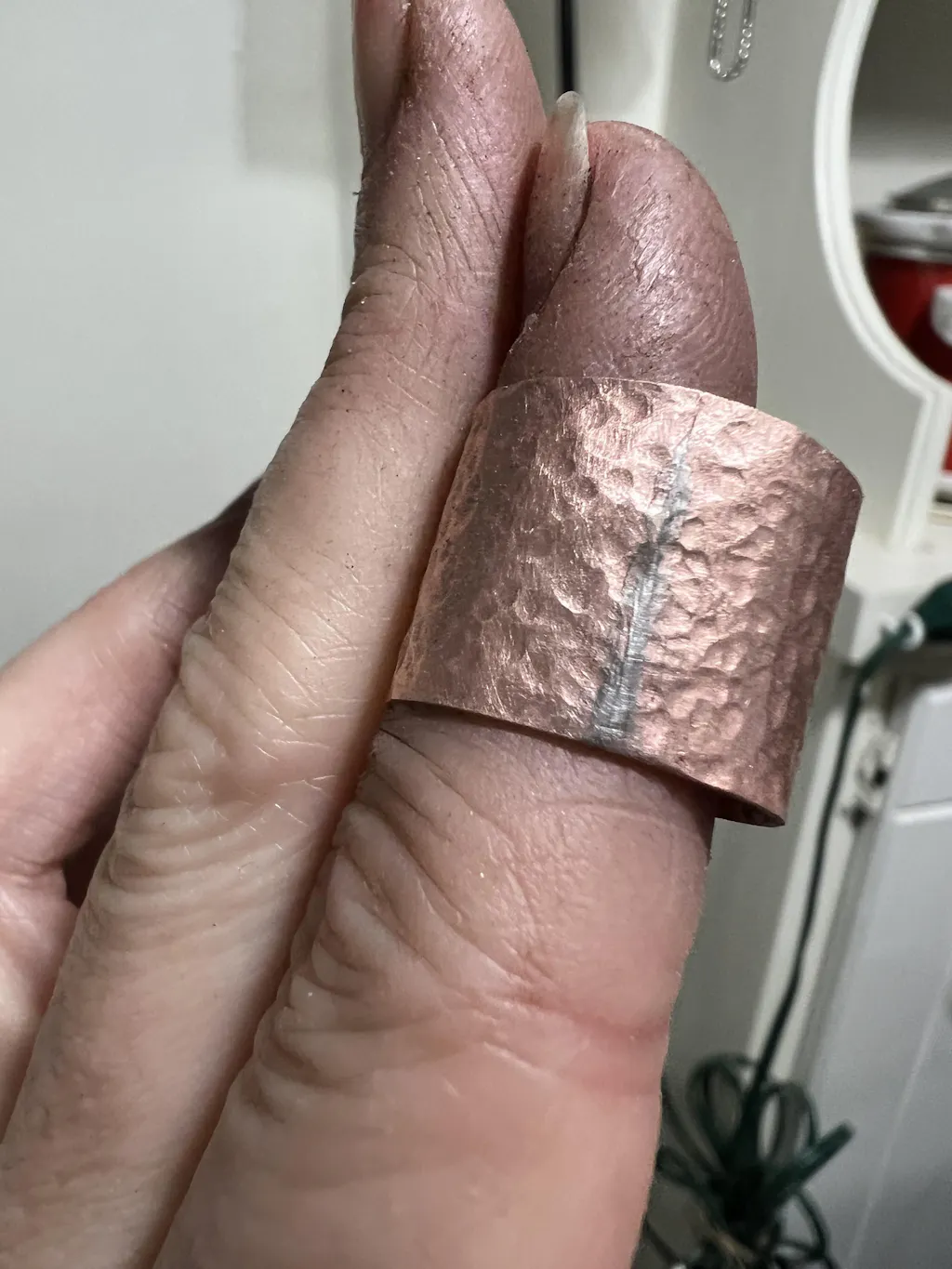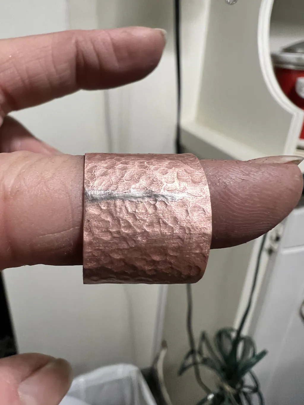In the pictures, you can see the solder is very silver. My first review was negative of this particular product. However, once it sits for just a tiny bit, and the copper begins to oxidize for whatever reason the solder oxidize along with it, and you can barely see it. It is much better than a silver solder you’re trying to hide and it is a very good match to copper, but you have to wait just a day for it to oxidize, for your brain to forget that it was silver and then when you go back to it, you’ll be like where is my seam?