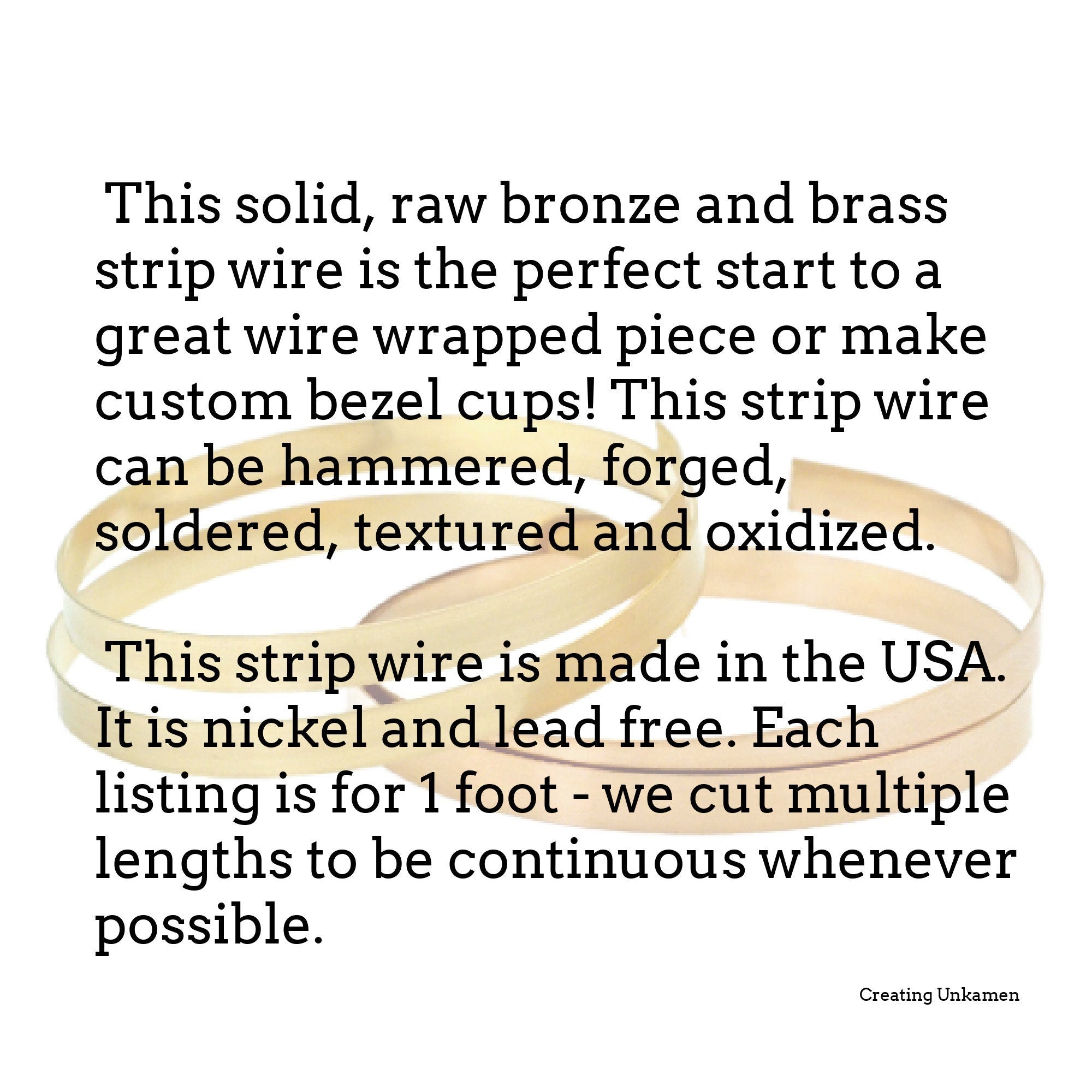 This solid, raw bronze and brass strip wire is the perfect start to a great wire wrapped piece or make custom bezel cups! This strip wire can be hammered, forged, soldered, textured and oxidized. This strip wire is made in the USA. It is nickel and lead free. Each listing is for 1 foot - we cut multiple lengths to be continuous whenever possible.