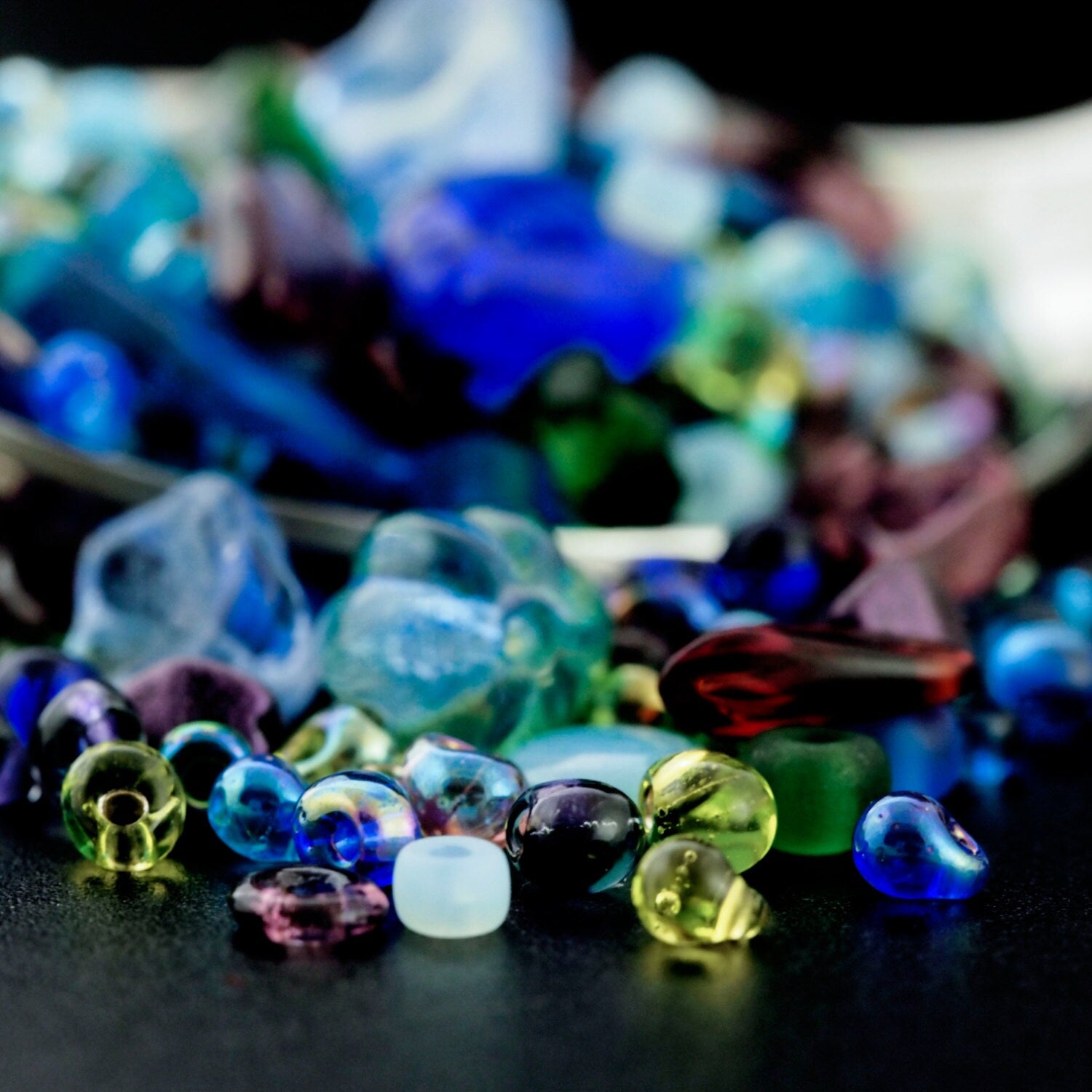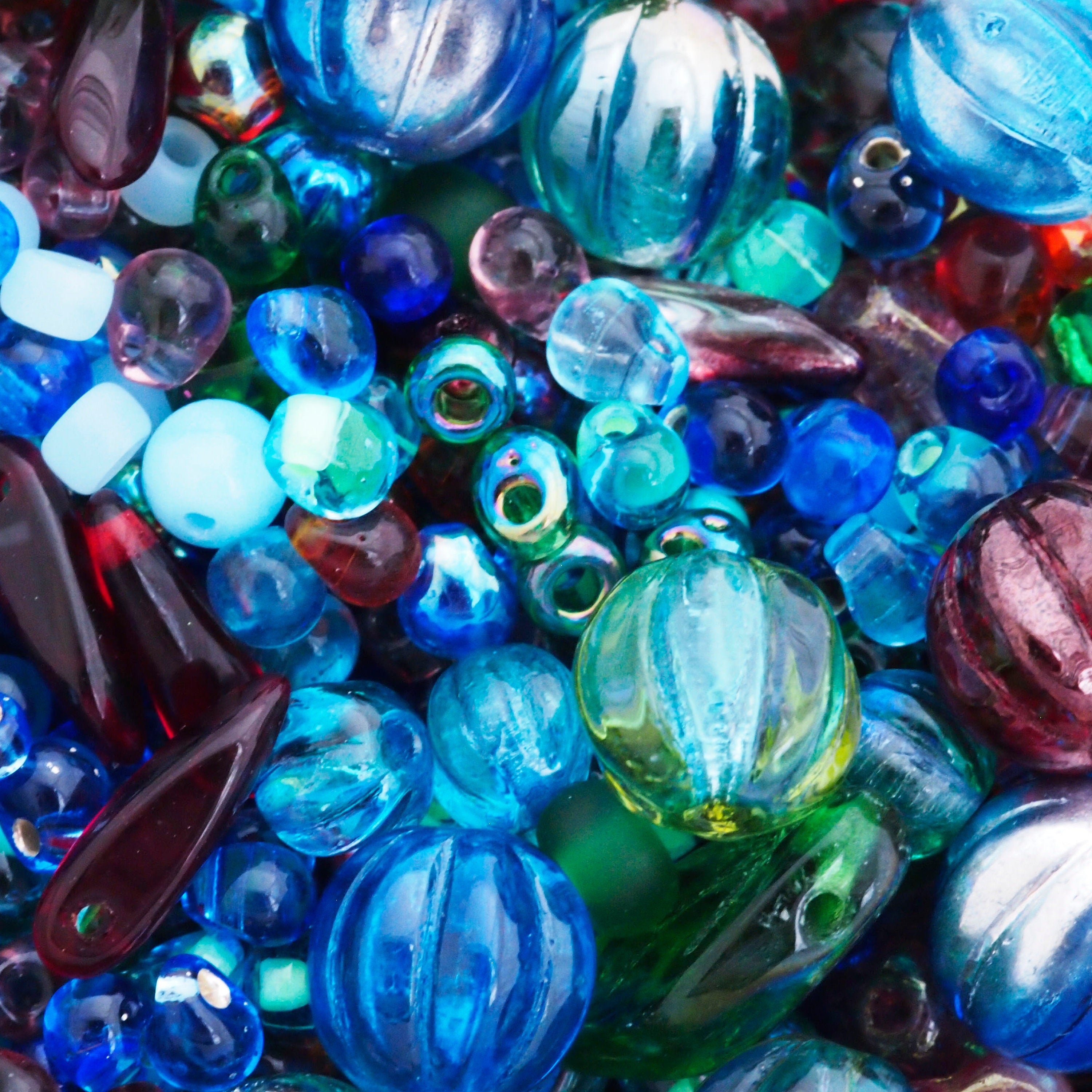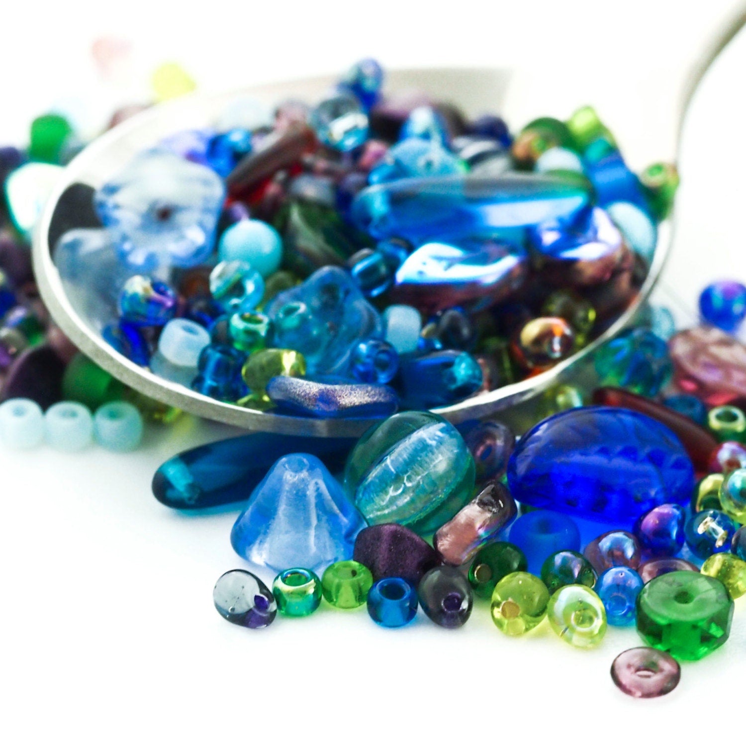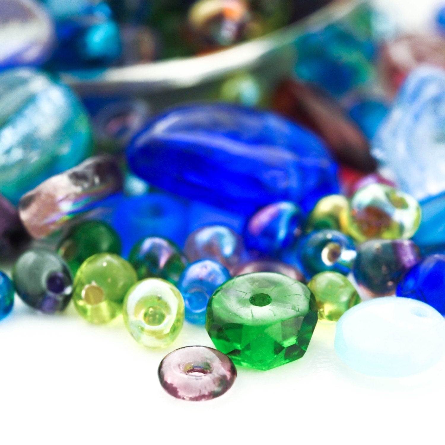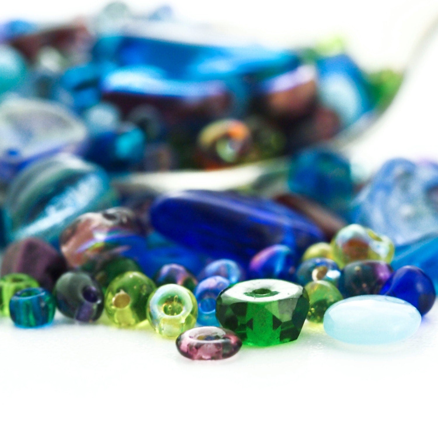 This little bag of beads is a very nice mixture of blues greens and reds . Nice assortment of shapes too!