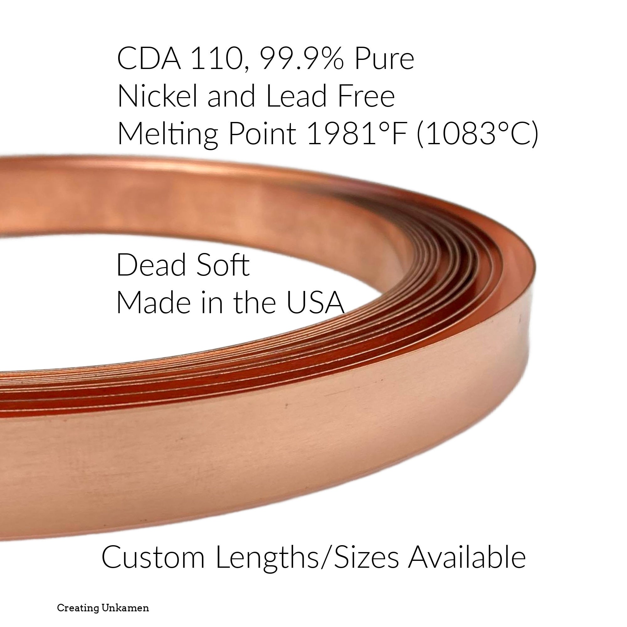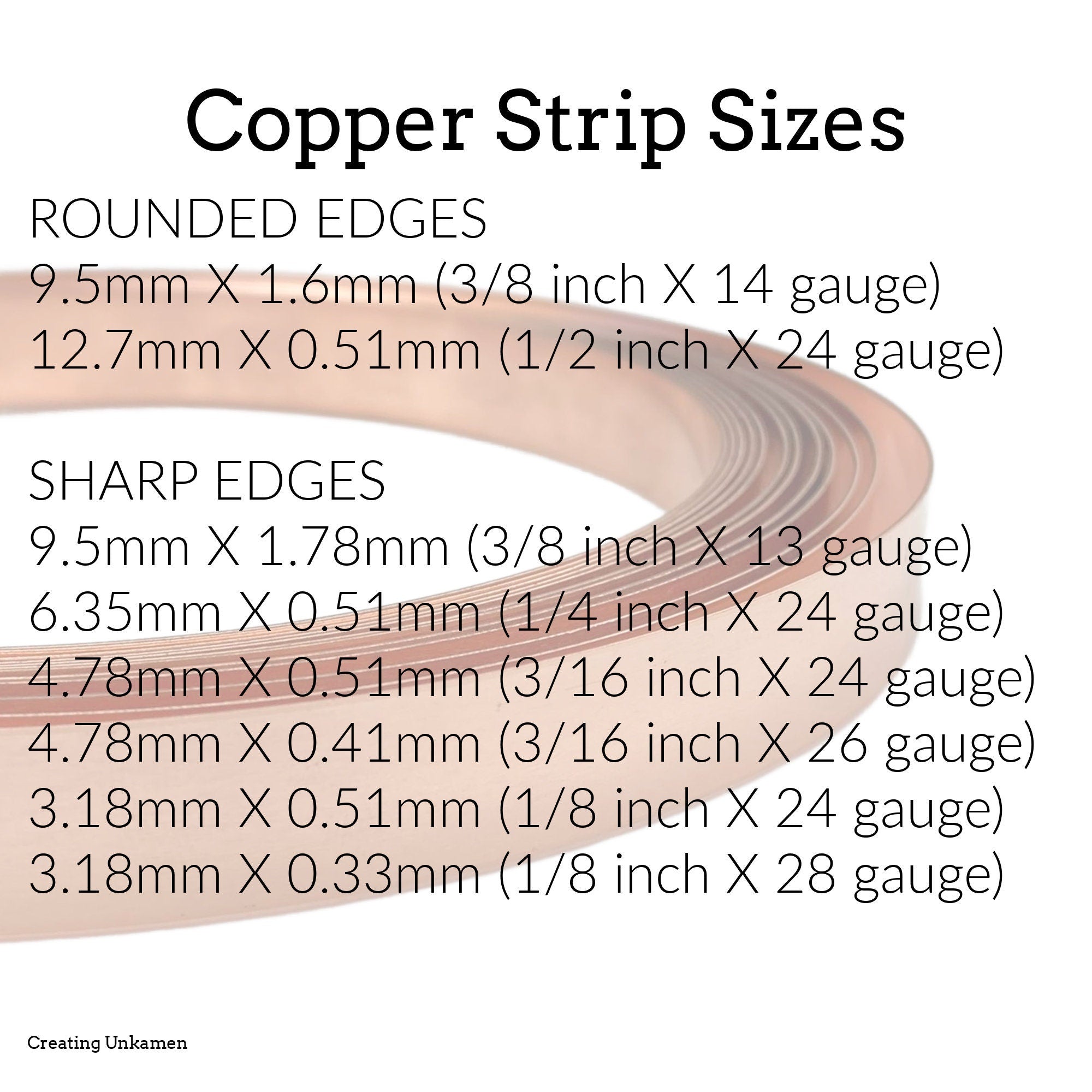 This solid, raw copper strip wire is the perfect start to a great bracelet or ring or use it to make custom bezel cups! This copper strip can be hammered, forged, soldered, textured and oxidized. This is 99.9% pure copper (CDA 110) and is made in the USA. It is nickel and lead free. Select from 2 sizes with rounded edges or 6 sizes with sharp edges. Each listing is for 1 foot of copper strip - we cut multiple lengths to be continuous up to one pound.
