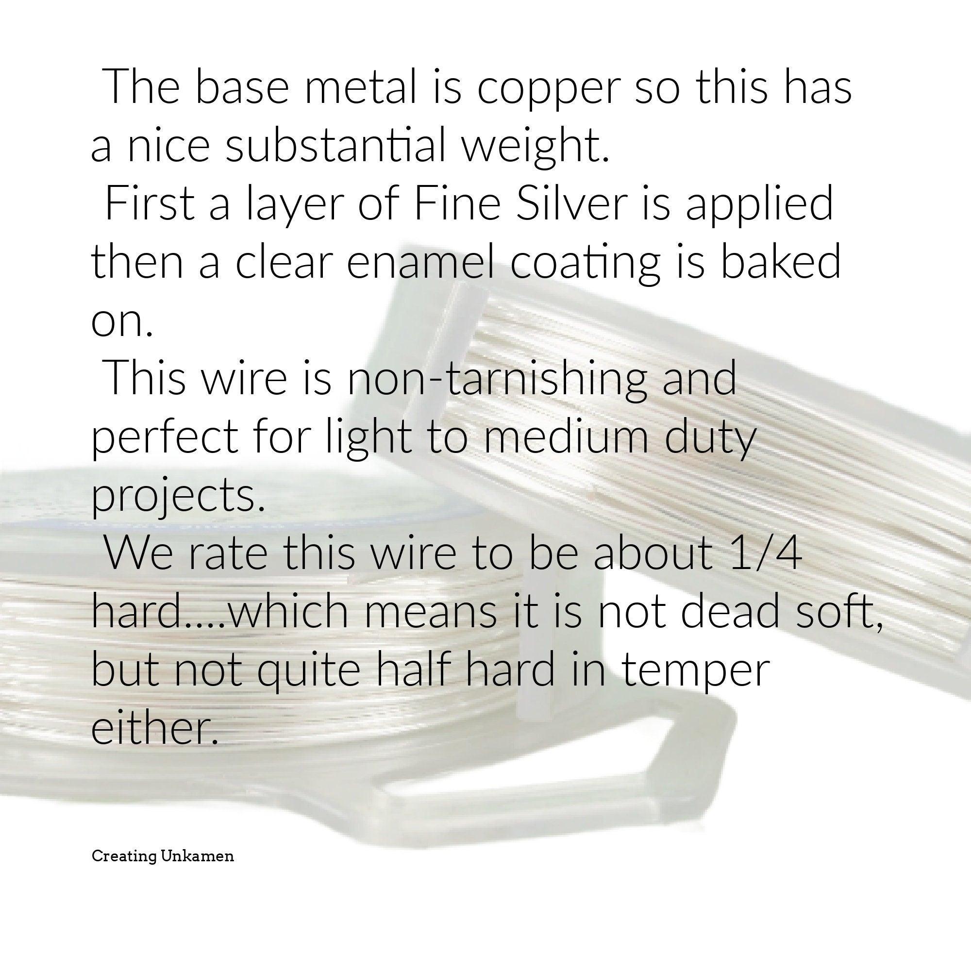 This Artistic Wire Non Tarnish Silver Plate enameled coated copper wire is the same great wire we use to make our high quality jump rings and findings. The base metal is copper so this has a nice substantial weight. First a layer of Fine Silver is applied then a clear enamel coating is baked on. This wire is non-tarnishing and perfect for light to medium duty projects. We rate this wire to be about 1/4 hard....which means it is not dead soft, but not quite half hard in temper either.