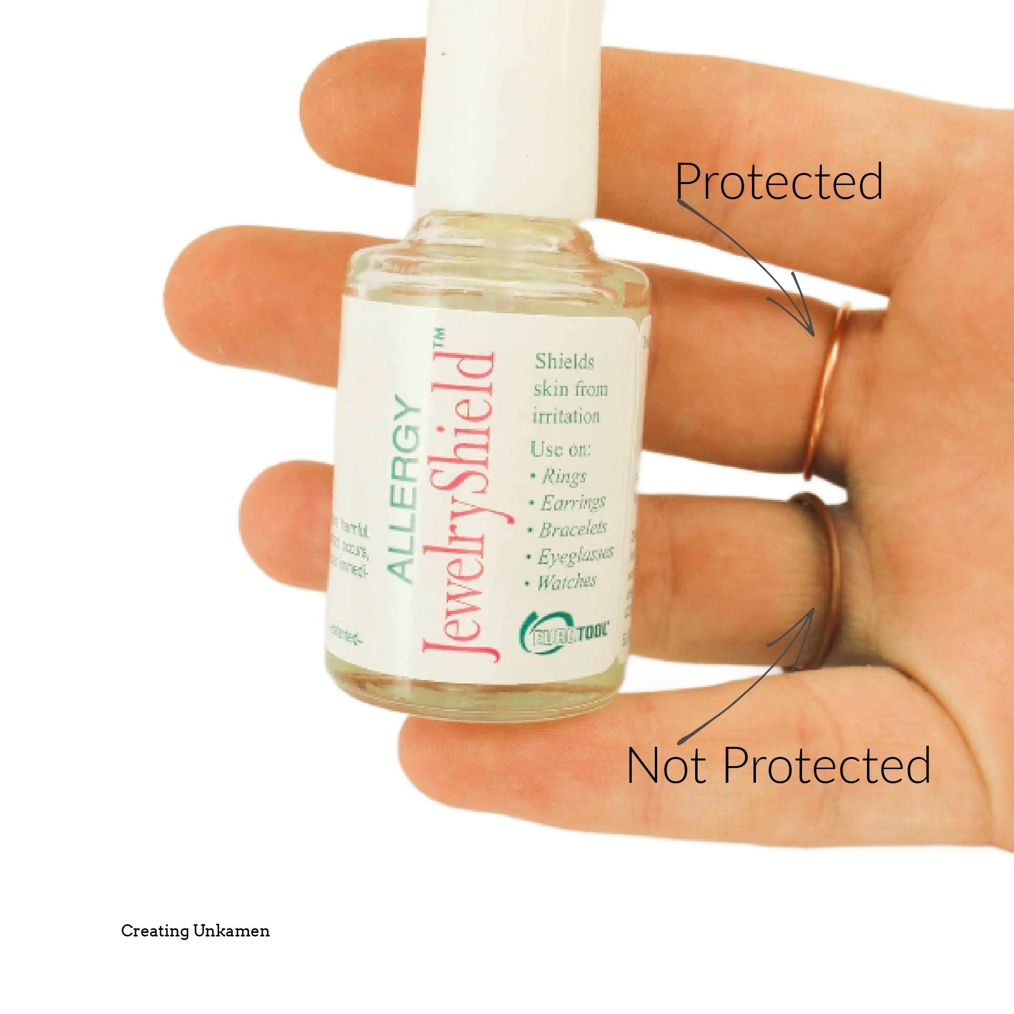 This listing is for a 1/2 ounce bottle of Skin and Jewelry Shield which you can use on rings, earrings, bracelets, necklaces and watches.