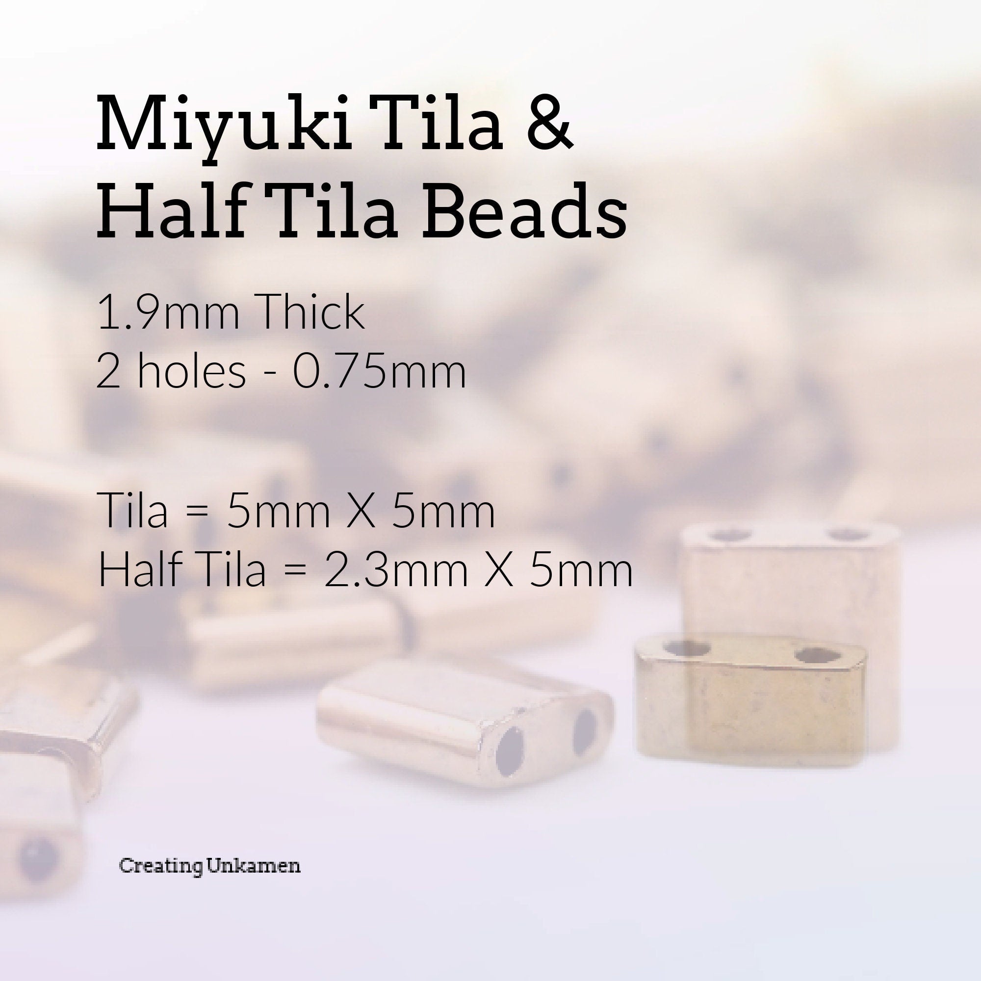 Tila: These beads are also called TL-4504. They measure 5mm X 5mm, are 1.9mm thick and have 2 holes that are .75mm. Each listing is for 3 grams, about 33 Beads, or Buy in Bulk and Save!
